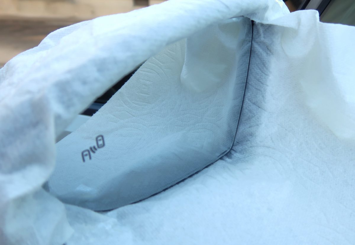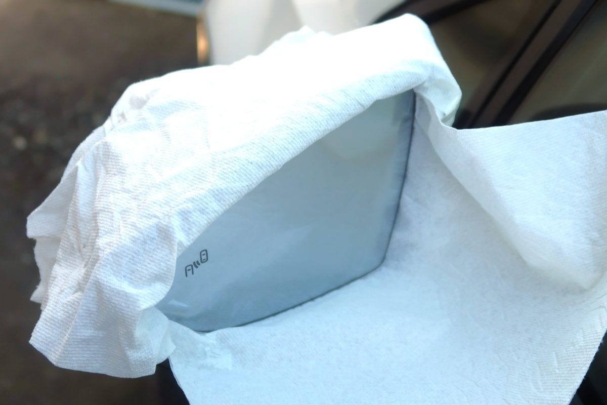 洗車してミラー部を水滴を完全に取り除いてミラー周りをペーパーで養生しました!