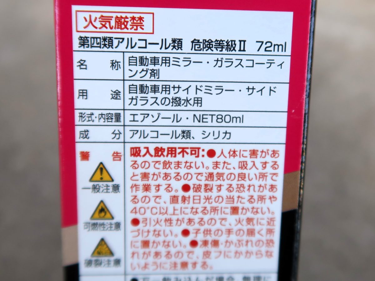 これ1本に80mlが封入されており、サイドミラー20個分も施行できるそうなので、車1台の両サイドのミラーに2ヶ月に1回施行するとして20ヶ月は使えそうですね♪