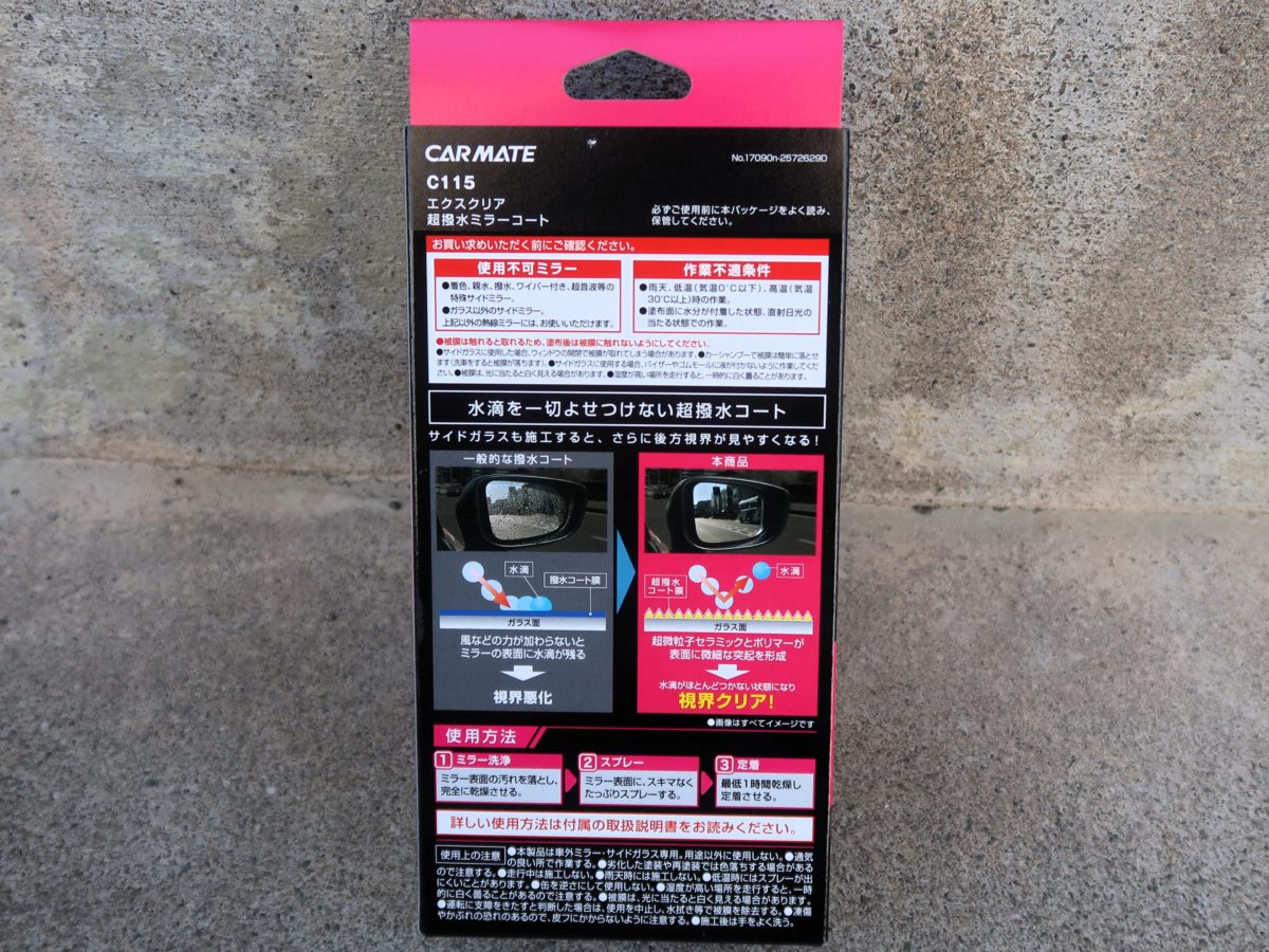 今回はCARMATE(カーメイト)のC115 エクスクリア 超撥水ミラーコートを試してみました!