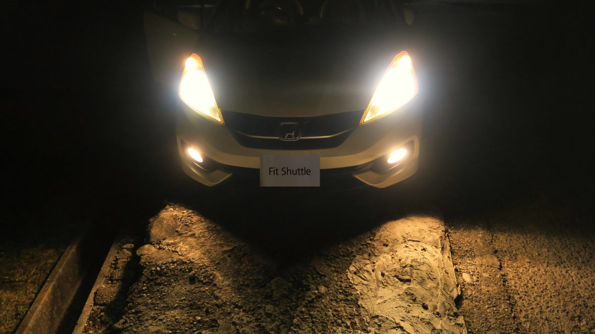 今回はフィットシャトルフォグランプに付いていた純正ハロゲンバルブからHID屋イエロー(3300K)ホワイト(6500K)の2色切り替えできるLEDバルブに交換してみました。
