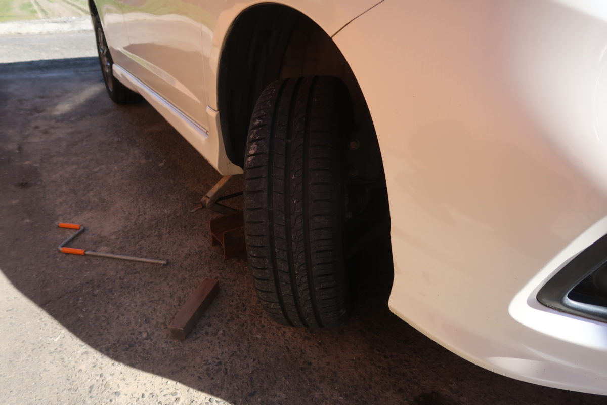 私の手元にはパンタグラフジャッキしかなかったので、ジャッキ棒を気合でグルグル回して車体を上げていくのですが、浮き始める頃になるとジャッキ棒の回転がかなり重くなり、手にも更に力を加えないと動かなくなってくるので大変でした!💦