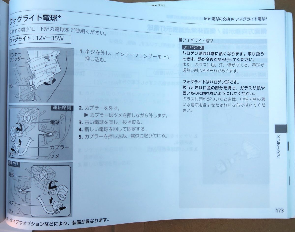 オーナーズマニュアルにもフォグライトの交換方法が記載されていました♪