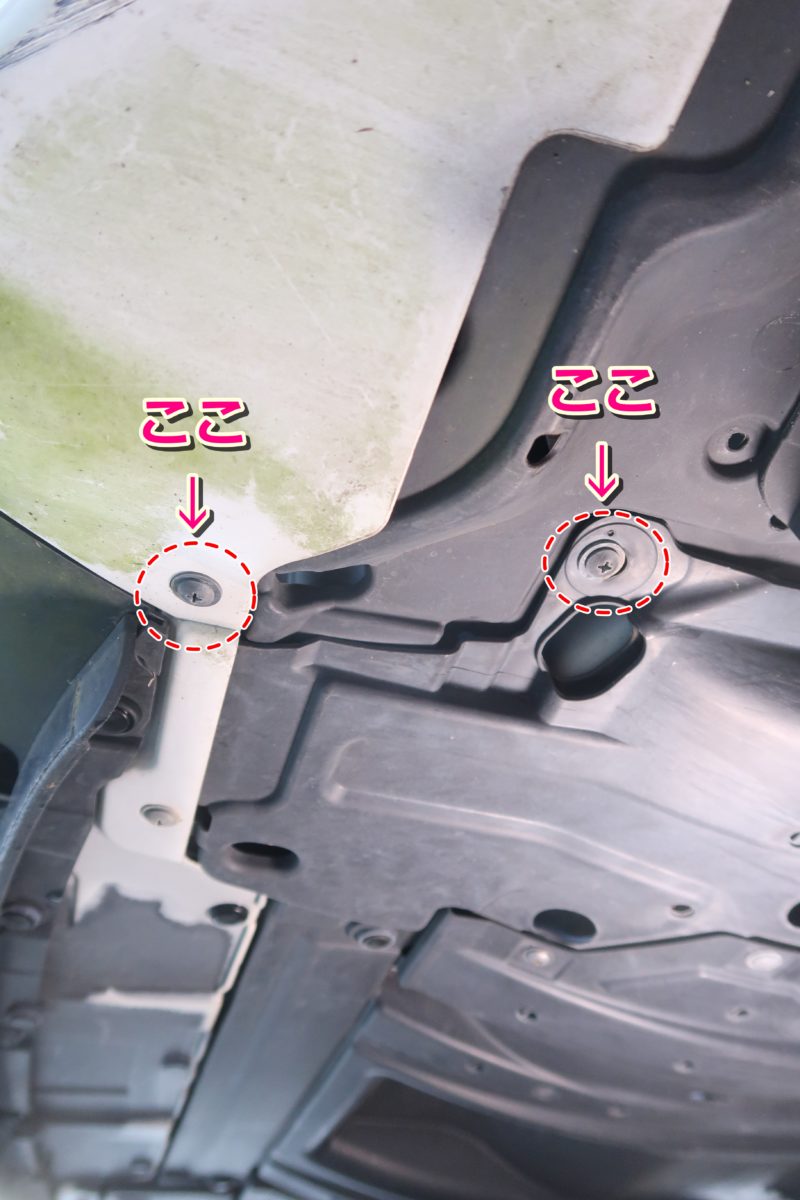 オーナーズマニュアルによるとこの2本のネジを外せばインナーフェンダーを上に押し込む事ができるそうです。