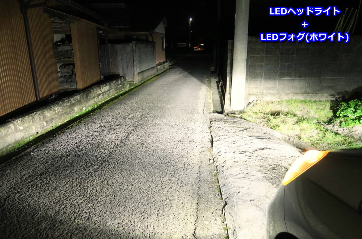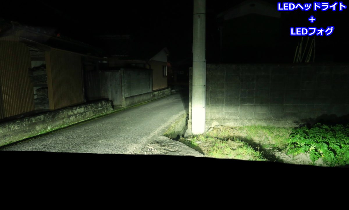 変ったのは明るさだけでなく、この状態のヘッドライトフォグランプ(ホワイト)6500K(ケルビン)純白に近い色温度なので物の色もハッキリと認識ができ、純正バルブでは発見できなかった塀の地面付近に草が生えていたという事もこれなら分かりますよね♪
