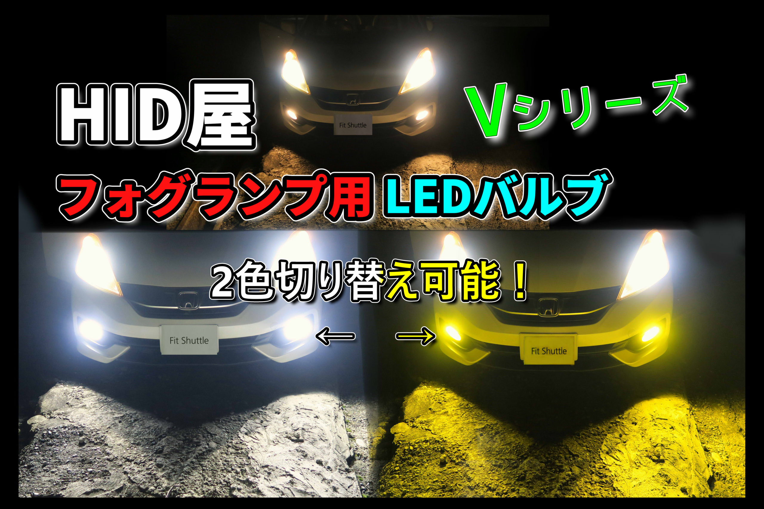 今回はフィットシャトルフォグランプに付いていた純正ハロゲンバルブからHID屋イエロー(3300K)ホワイト(6500K)の2色切り替えできるLEDバルブに交換してみました。