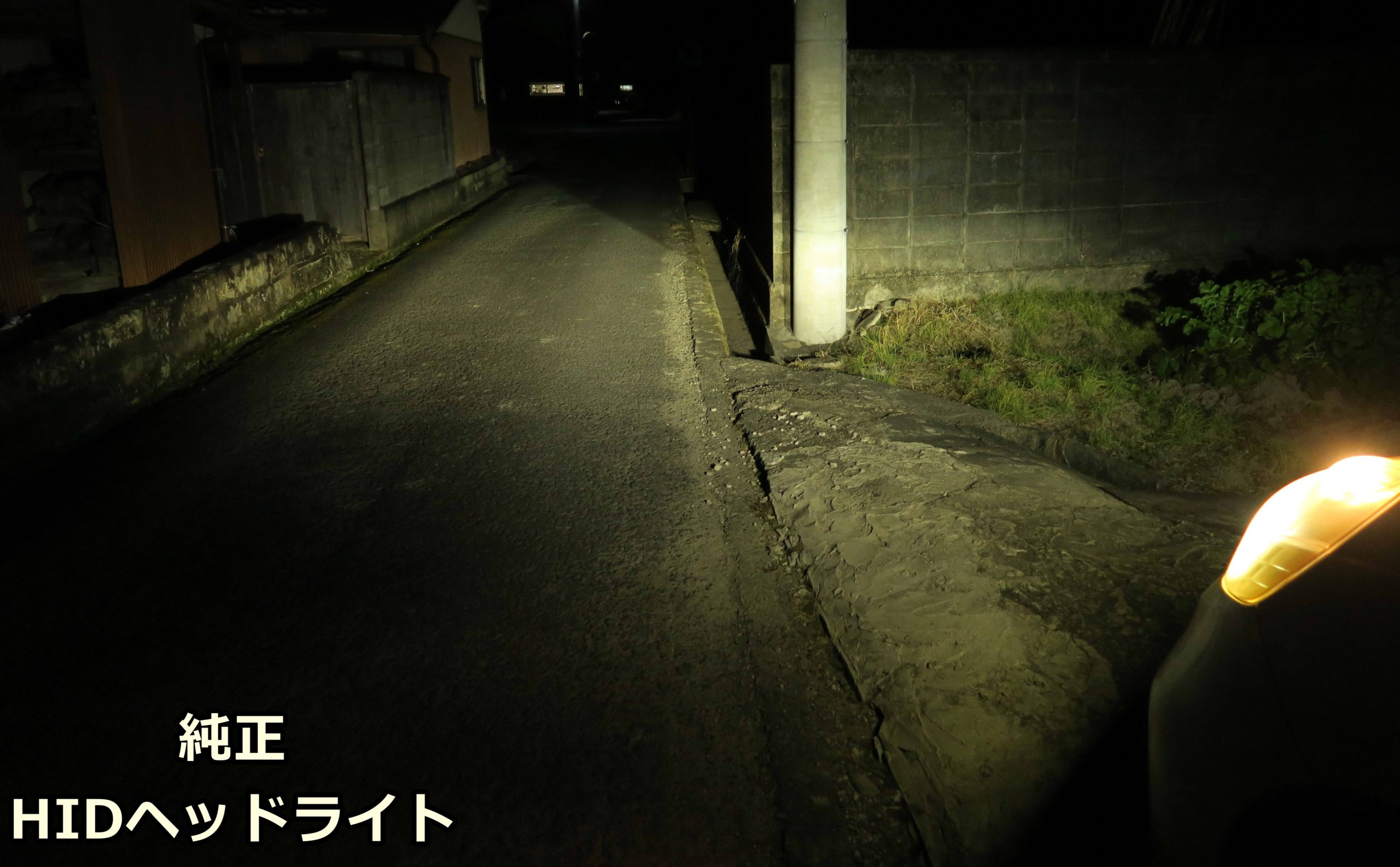 歩行者目線からヘッドライト部分を見ると、純正HIDよりやや光が強くなったように感じました。