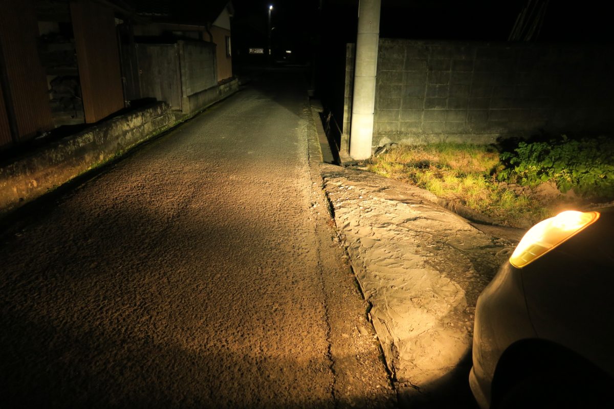 LEDバルブに交換後は照らされている路面の凹凸がハッキリ分かるようになり、肉眼でも明らかに光量の違いを感じる事ができました!