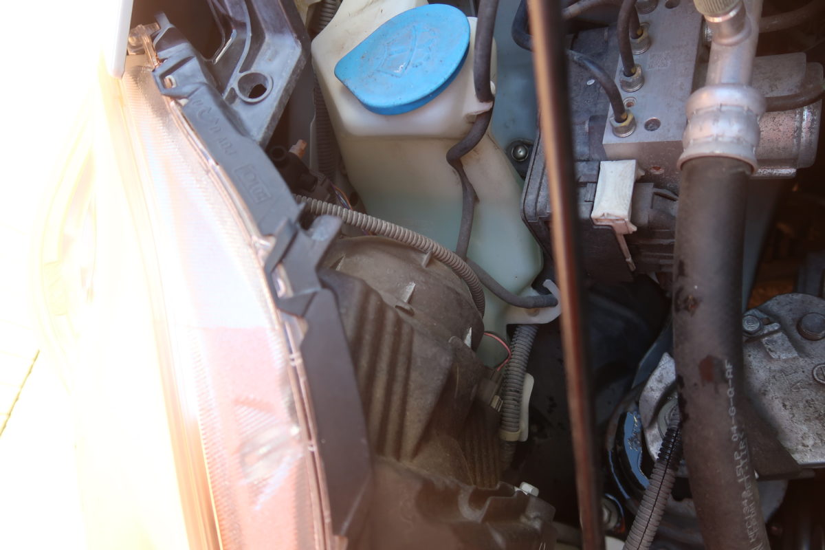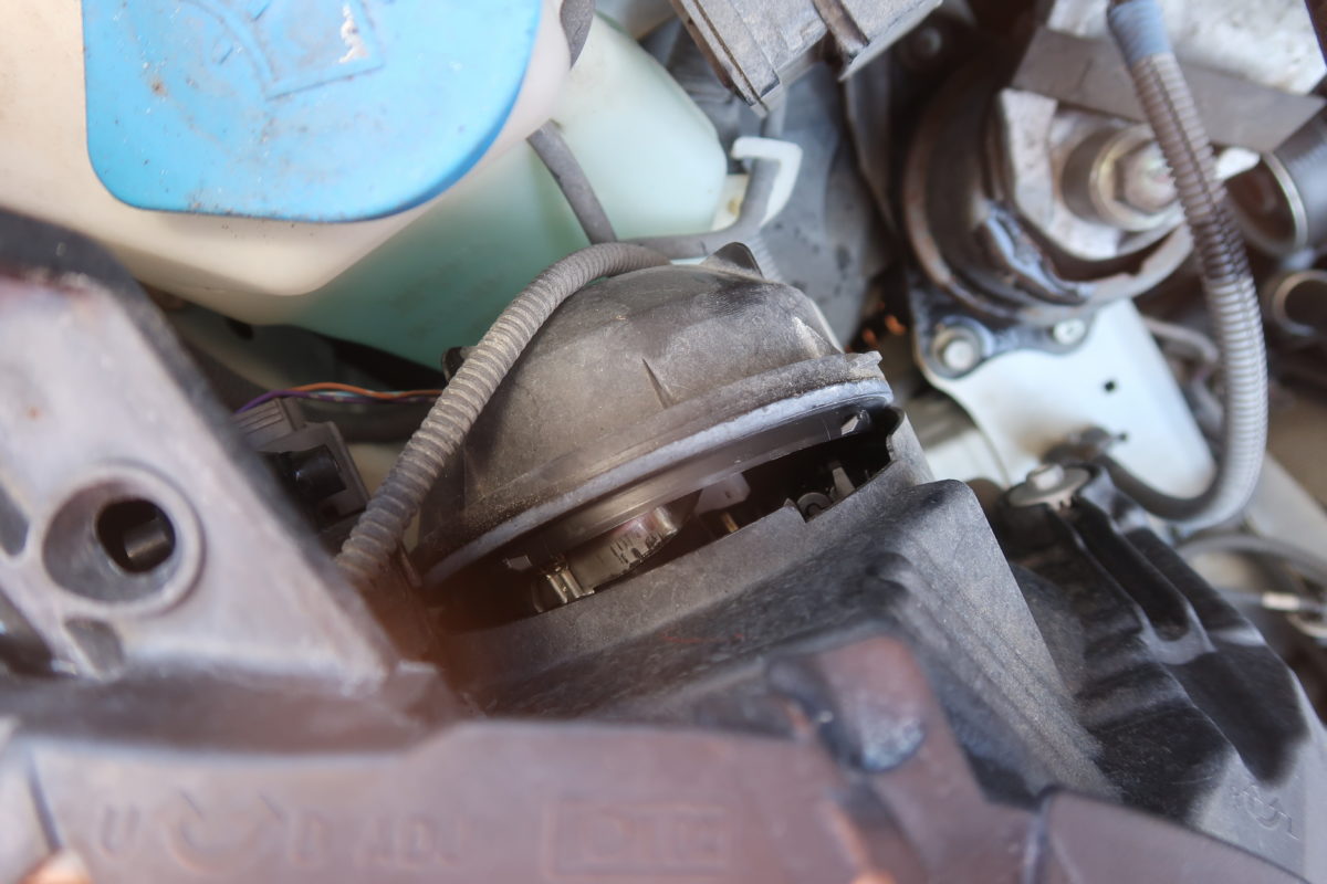 ボンネットの中のヘッドライトのバルブがある直ぐ真後ろ辺りに黒くて丸っこいが見えています。