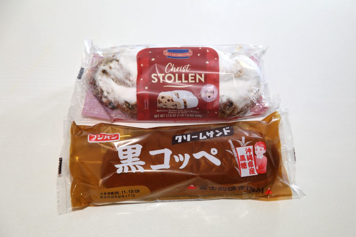 大きさの比較の為にフジパン黒コッペ500gのシュトーレンを並べて見ました♪