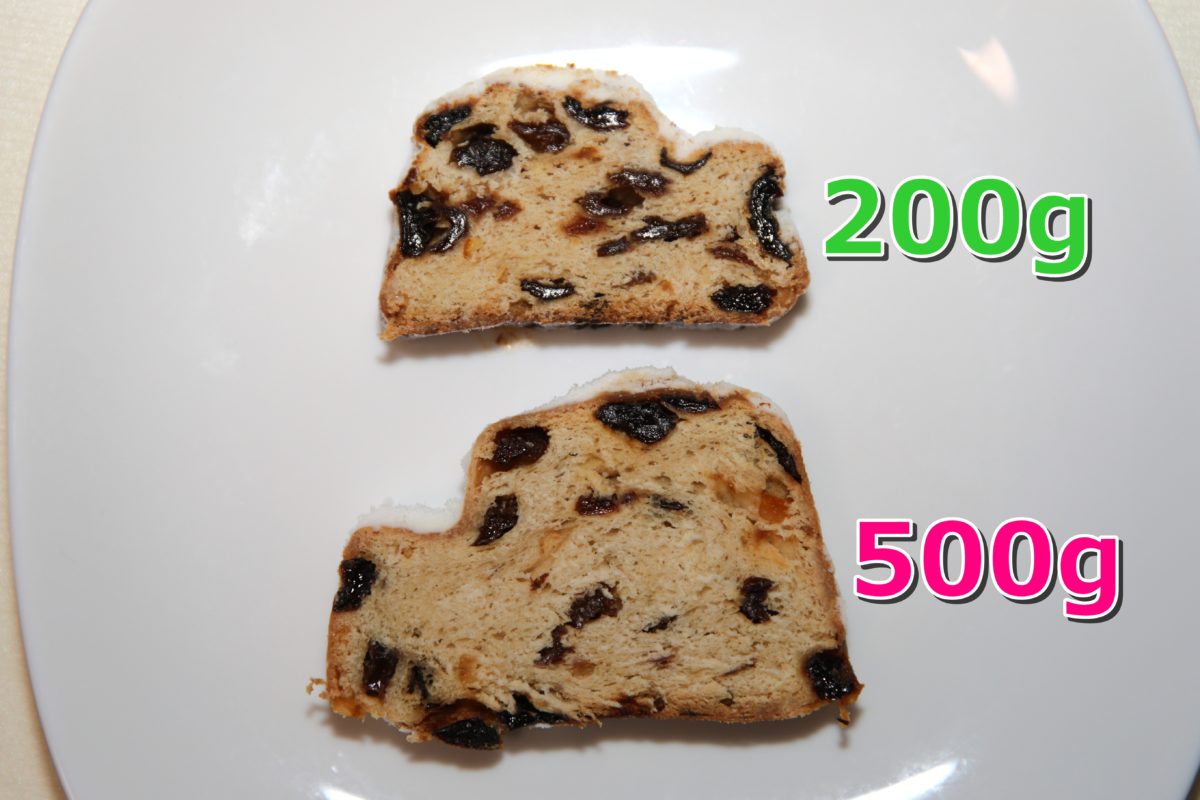 見た目が丁度ほぼ同サイズのこの二つですが、黒コッペは片手でもなんなく持ち上げる事が出来ましたが、500gのシュトーレンの方は油断すると片手では滑り落ちる程重かったです!💦