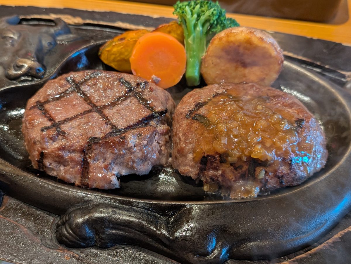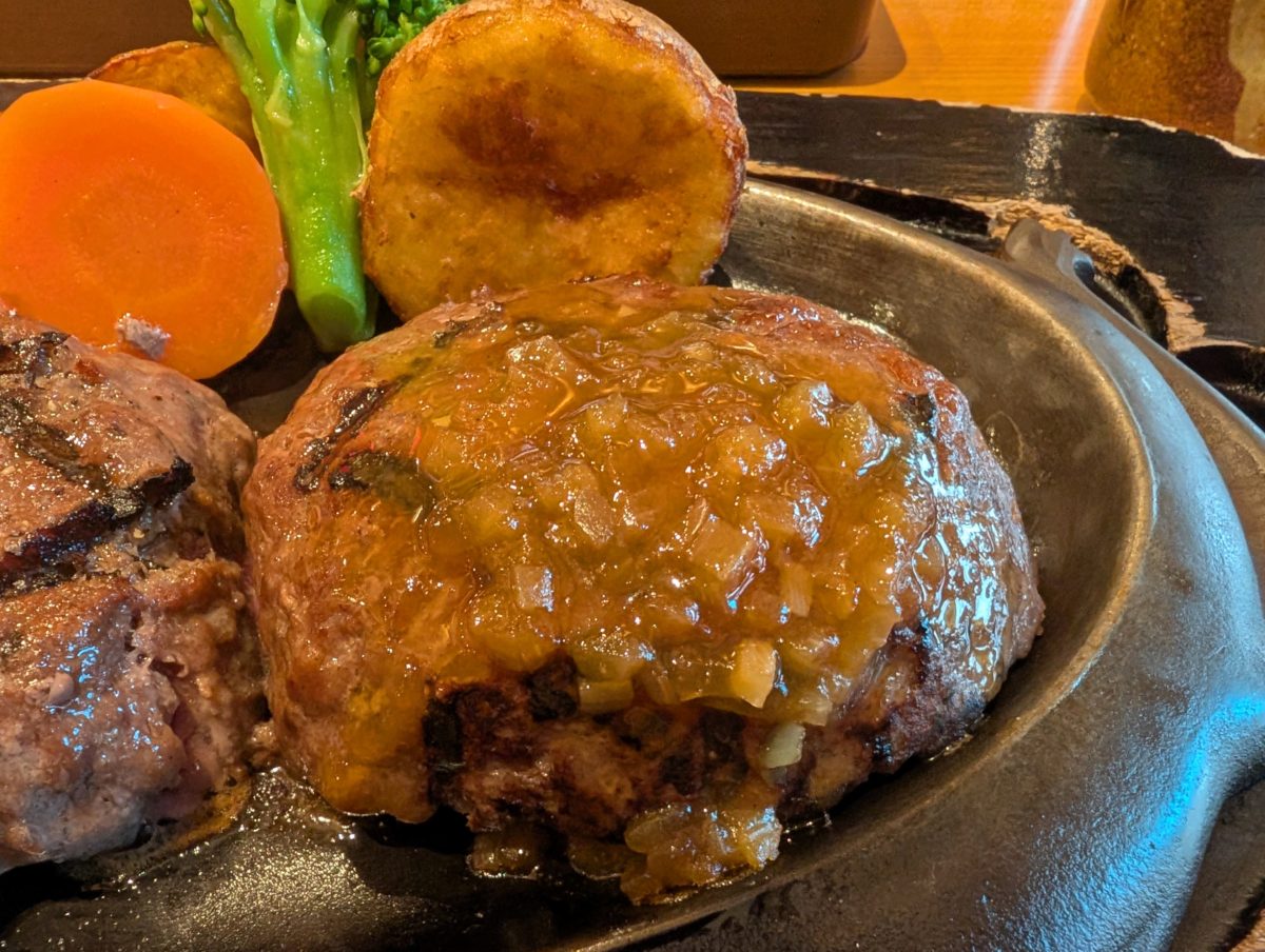 ハンバーグにかけるソースが2種類有り、オニオンソースデミグラスソースのどちらかを選択できます。