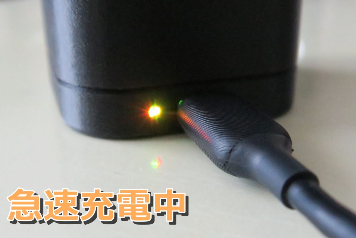 PD充電ケーブルなどを使用した急速充電中には赤と緑のLEDが同時点灯してオレンジ色に発光しているように見えます。